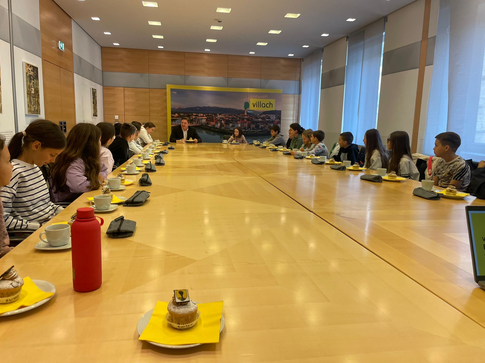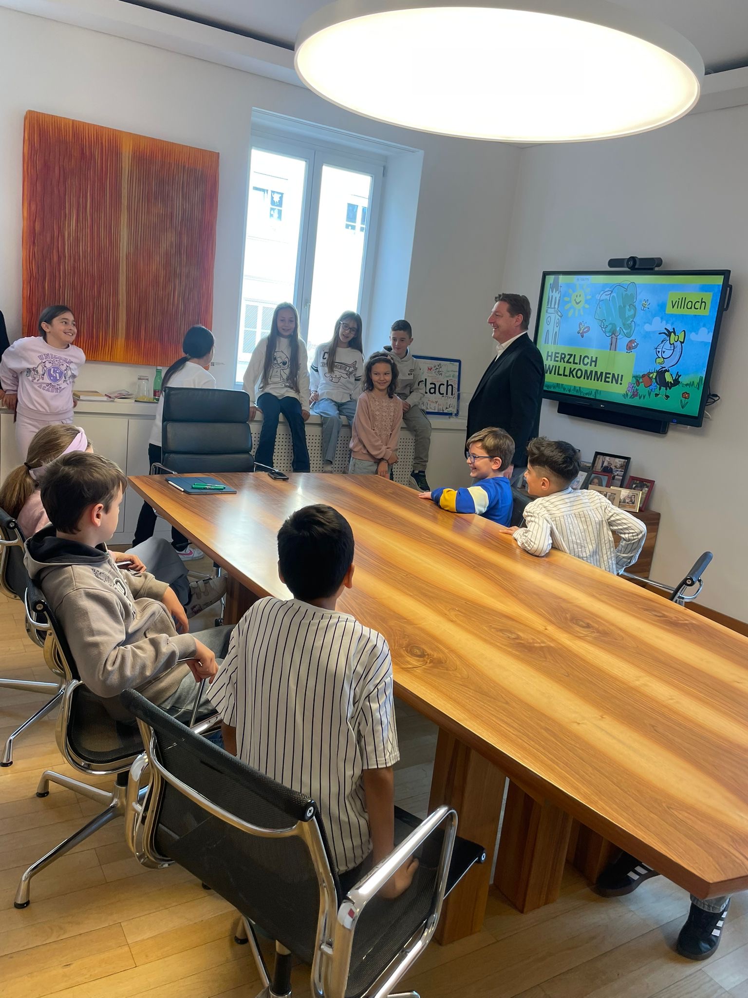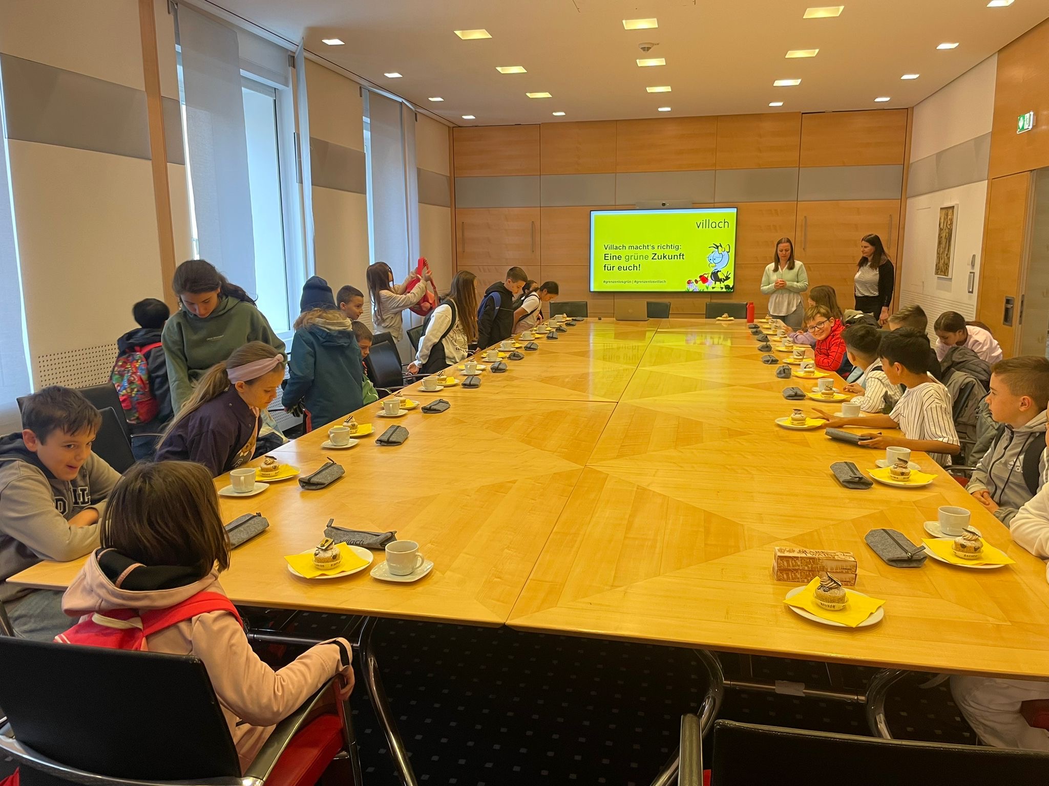 Am 16. April hatten wir einen ganz besonderen Tag, denn wir durften den Bürgermeister von Villach, Günther Albel, besuchen! Um 8:45 Uhr wurden wir freundlich empfangen und starteten mit einer spannenden Führung durch das Rathaus. Dort hörten wir viele interessante Geschichten über Villach, das Stadtwappen und wie es sich im Laufe der Zeit verändert hat. Besonders toll war die Büste von Dr. Paracelsus, über den wir viel gelernt haben. Danach hatten wir die Chance, den Bürgermeister persönlich zu treffen! Er überraschte uns mit leckerem Kakao und Muffins und beantwortete im Sitzungssaal viele Fragen, die wir am Vortag vorbereitet hatten. Es war super spannend, mehr über seine Arbeit zu erfahren! Außerdem durften wir sein Büro anschauen, das mit tollen Bildern geschmückt war. Um 10:00 Uhr mussten wir uns dann leider verabschieden, weil der Bürgermeister einen straffen Zeitplan hatte. Danach fuhren wir mit dem Bus zum Wasserwerk, wo uns Herr Ingenieur Reinold Tosin schon erwartete. Er erzählte uns, woher das Wasser in Villach kommt, und wusste viel über die 14 riesigen Speicherbehälter, die mehr als 23 Millionen Liter Wasser fassen können. Wir durften das Auffangbecken sehen und die Anlage, die das Wasser reinigt. Dabei erklärte uns Herr Tosin, dass das mit UV-Licht passiert – das klang echt spannend! Es war ein aufregender und lehrreicher Tag, den wir so schnell nicht vergessen werden!